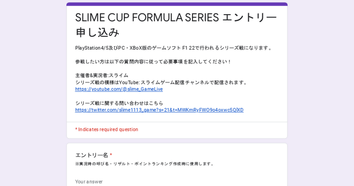 SLIME CUP FORMULA SERIES エントリー申し込み